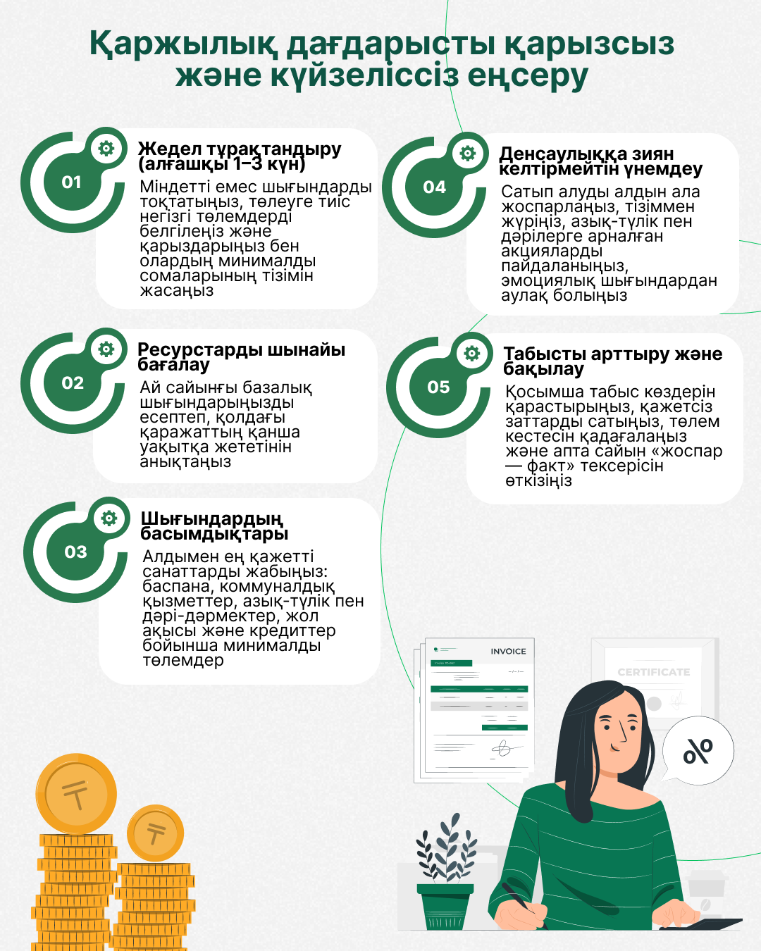 Ай күндері бойынша төлемдер күнтізбесін жасаңыз, еске салғыштарды қосыңыз. Аптасына бір рет «жоспар/факт» салыстыру, соманы түзету, отбасылық қағидаларды талқылау (10-15 минутқа).
