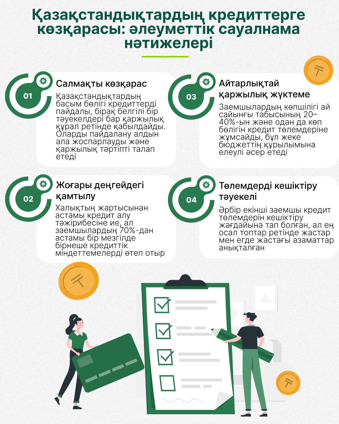 Көп кредит алу және борыш жүктемесі. Респонденттердің 36,2%-ында бір кредит, 27,2%-ында екі, 8,2%-ында үш немесе одан да көп кредит бар. Осылайша, қарыз алушылардың 70%-дан астамы бір уақытта бірнеше кредитке қызмет көрсетеді. Көпшілік үшін борыш жүктемесі жоғары болып қалады, 31% кірістің шамамен 20%-ын , 23,9% кірістің 30%-ын, ал 17,8% кірістің 40%-ын немесе одан да көп кредитке жұмсайды. Ең үлкен борыш жүктемесі Солтүстік Қазақстан, Қызылорда, Ақмола және Ұлытау облыстарында тіркелді, онда кірістің 40%-дан астам төлемдері бар азаматтардың үлесі 20%-дан асады.
