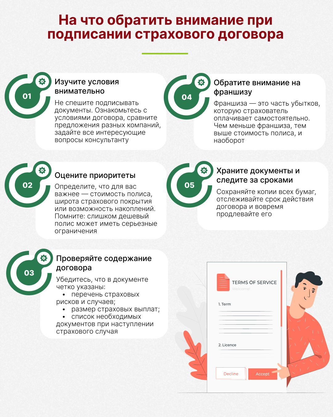При оформлении страховки главное — не торопиться. Дайте себе время изучить условия, сравнить предложения и задать все вопросы консультанту. Чётко определите, что для вас в приоритете: низкая цена, широкое покрытие или возможность накоплений.